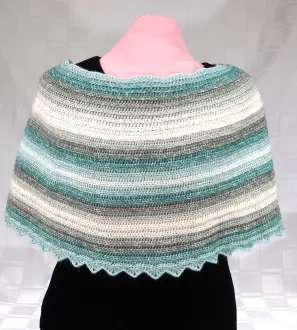 • Asymmetrical shawl, crocheted in white, gray, and malachite with...