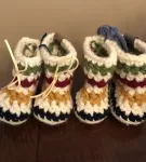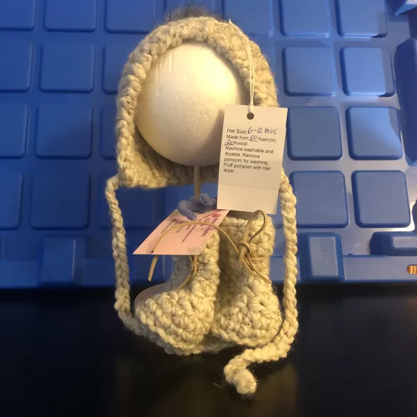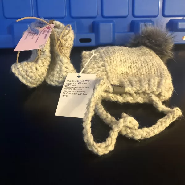 Baby Hat with matching booties set. Pixie style hat in size 6-12 months and features ties and a removable faux fur pompom. Crochet baby booties , Padraig -style in size 6-12 months. Booties have Ecosoft laces to tie onto babies feet, so they won’t fall off or be pulled off.