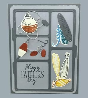 Fun fishing tackle box Father’s Day card with lures, hooks,...