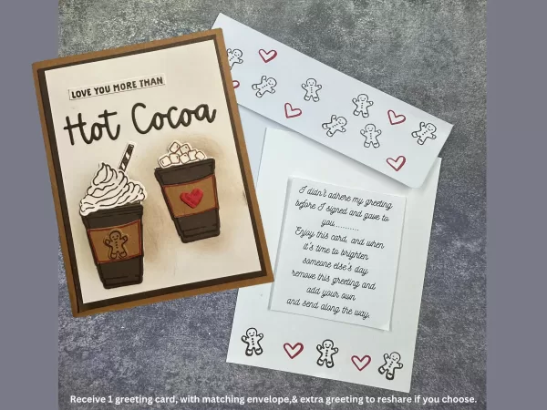 Content: 1 card, 1 Envelope, 1 Extra Greeting and special inclusion with message to customer to let them know they have option of this being a reusable card.