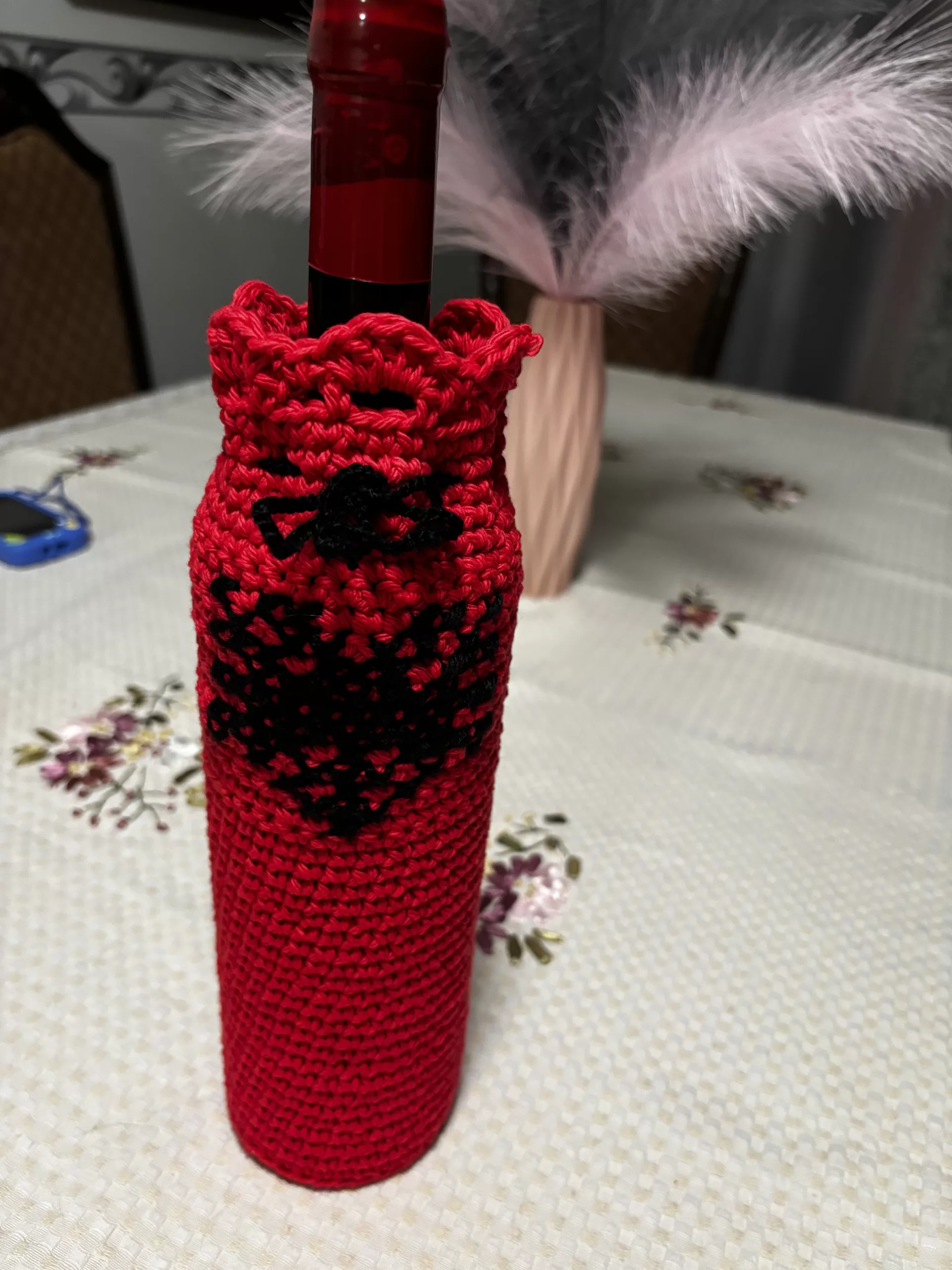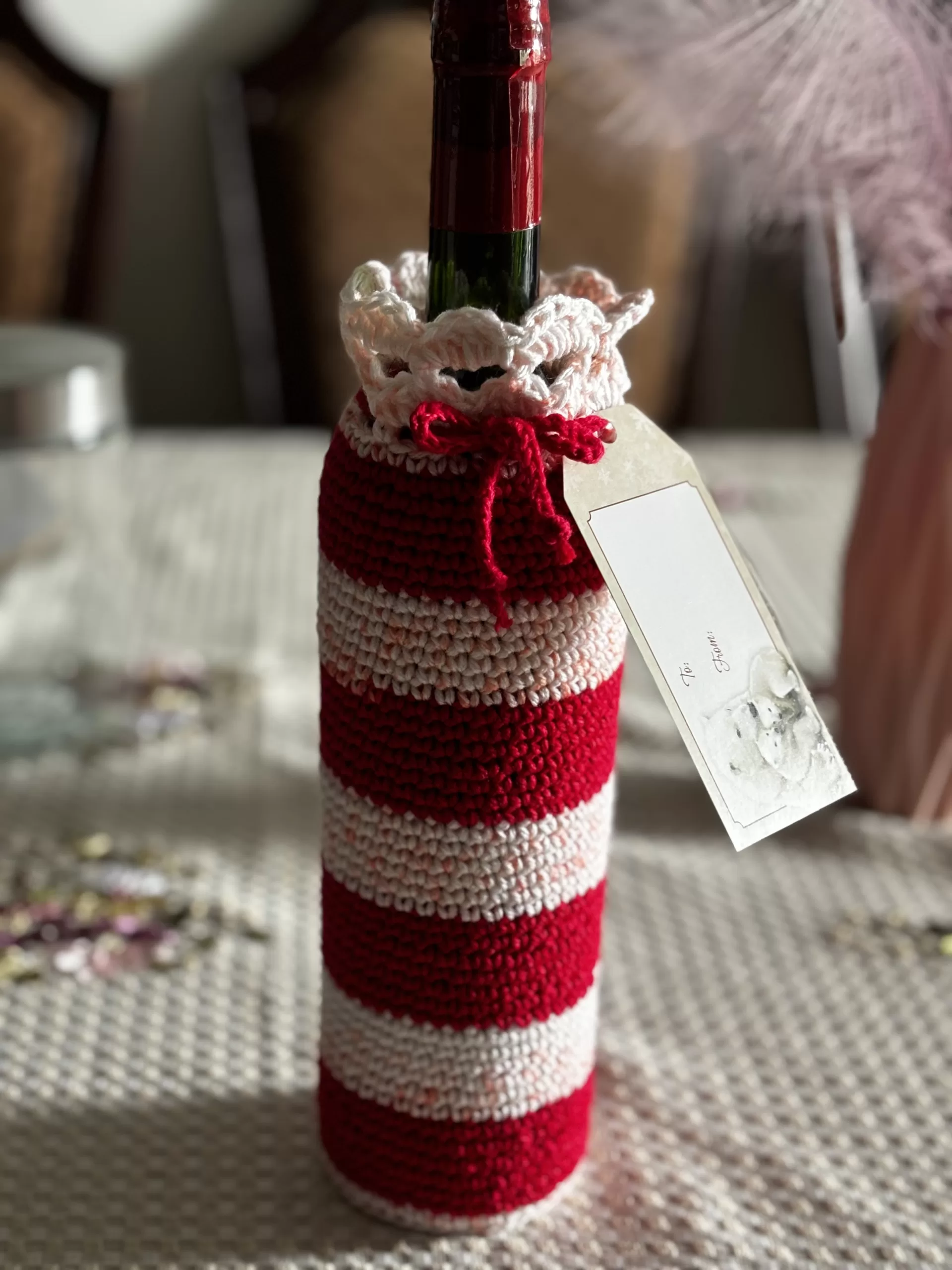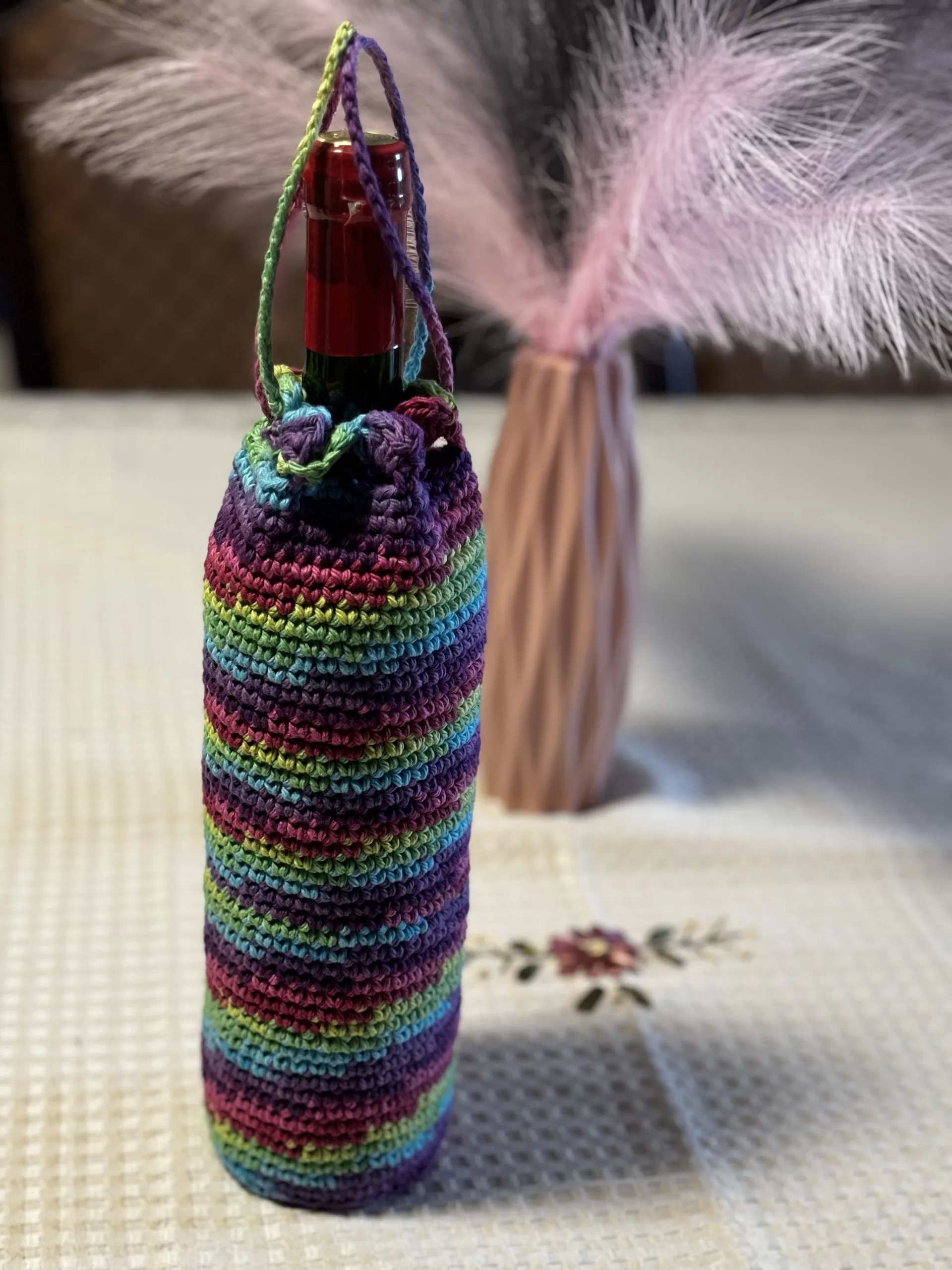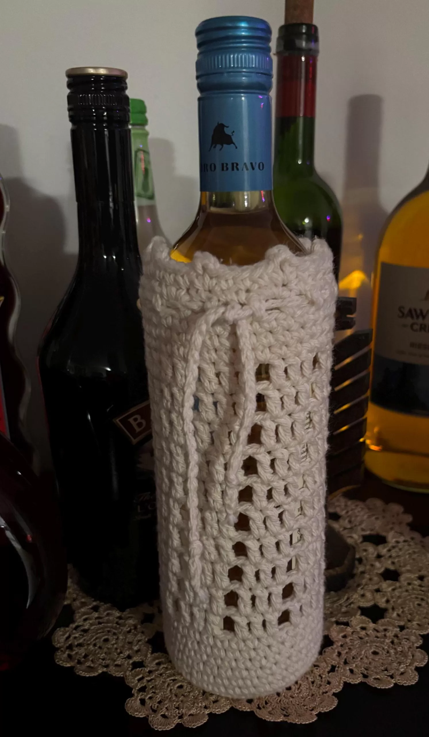 Crocheted sleeve, fits 750 ml wine bottles. Has a string that helps carrying the bottle like in a bag . Can make in any colour, design or size.