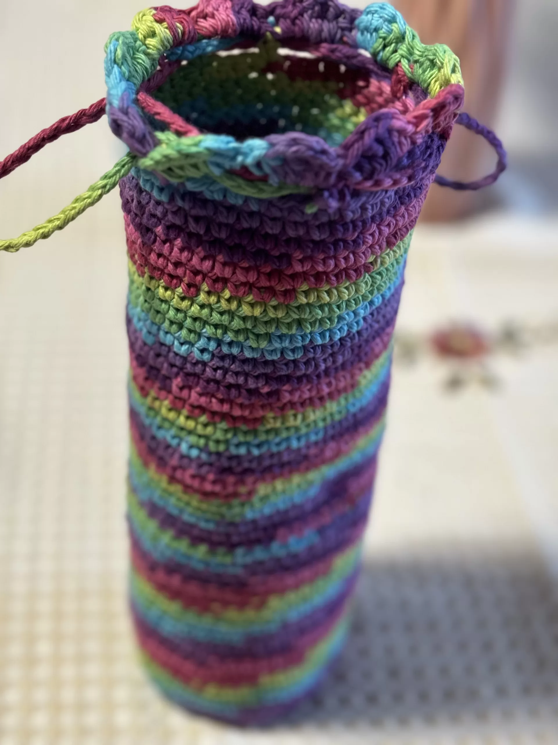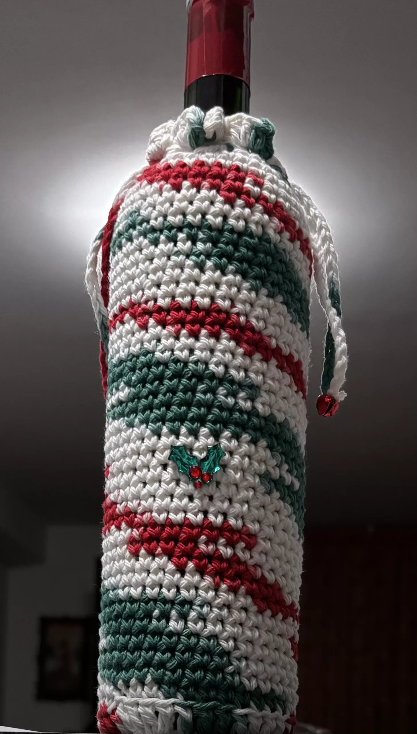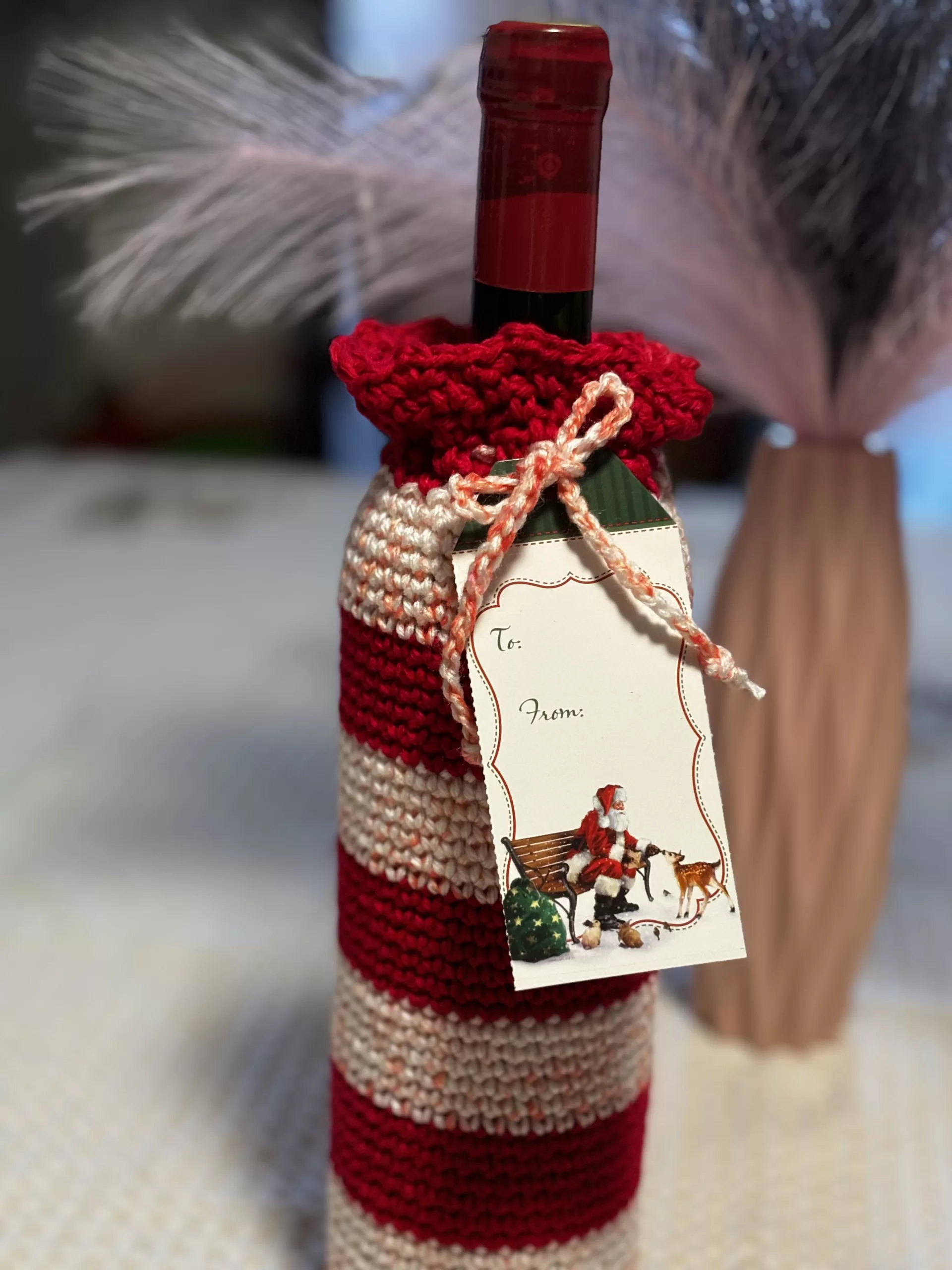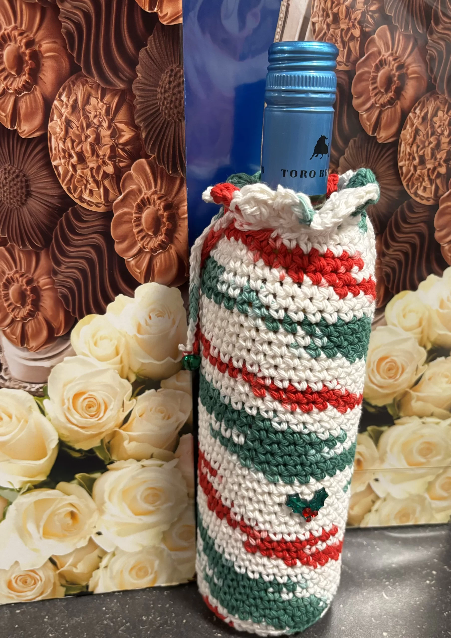 Crocheted sleeve, fits 750 ml wine bottles. Has a string that helps carrying the bottle like in a bag . Can make in any colour, design or size.