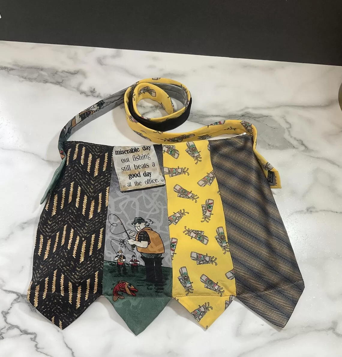 This striking purse combines yellow, black, and beige tones for a bold statement piece.  There is a golf tie and a fishing tie.  The vibrant tie is paired with a repurposed beige fabric backing, offering a chic contrast that is sure to catch eyes. With a reliable zippered closure, this purse is as practical as it is stylish, making it a versatile addition to any outfit.