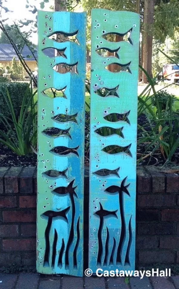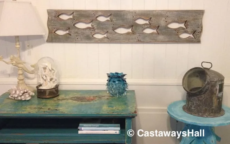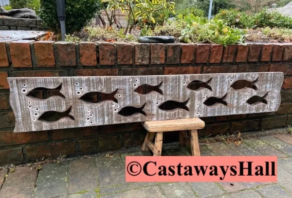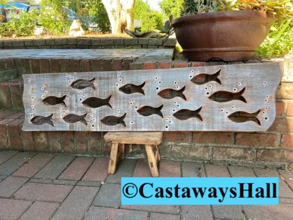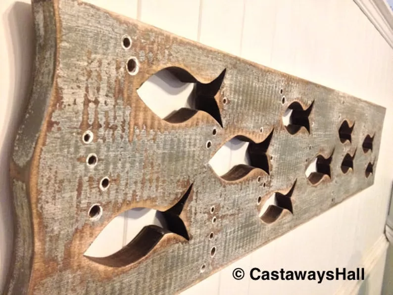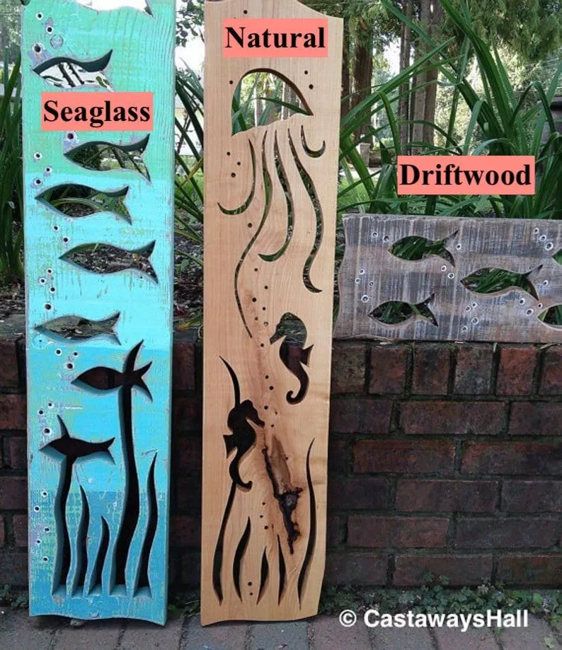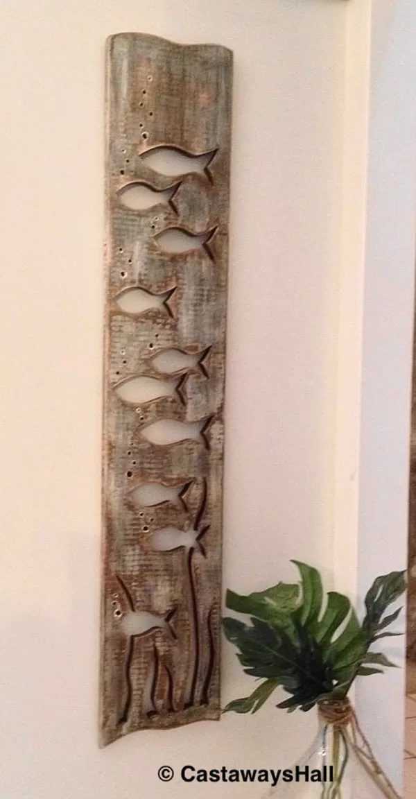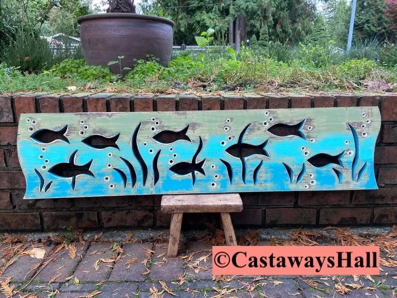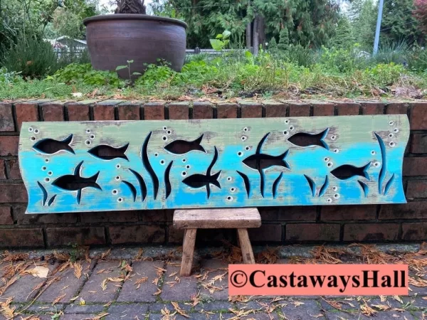 Add a touch of coastal charm to your space with this stunning HORIZONTAL school of fish cut out of wood and painted in a driftwood colouring, sea glass colours or natural finish. Choose which colour that you would like in the options. There is the Driftwood colouring which is a combination of white, grey and brown, Sea Glass, which is a combination of brown, yellow, green and various turquoise colours. The last one is Natural which is a clear sealer over the raw wood. The Driftwood and Sea Glass colours are distressed to bring out the colour layers. Perfect for any ocean lover or beach enthusiast, these handcrafted fish will bring a sense of serenity and beauty to your home decor. Hang it on your wall or display them on a shelf to create a calming nautical vibe. Â Comes ready to hang and is signed on the back. Other styles and sizes are available in my other listings.