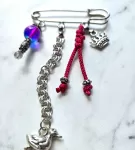 1.5″ long plastic clear w/ heart sparkled bear on silver tone sink chain. Can be opened to add other charms or removed.