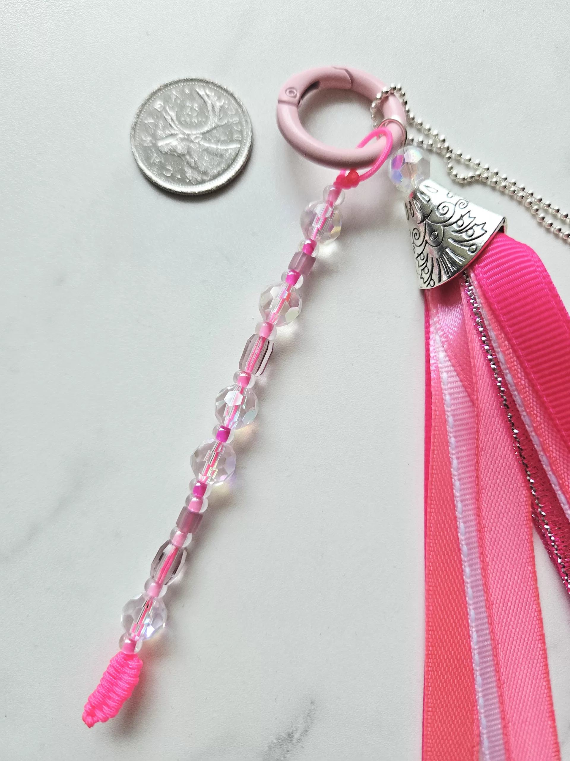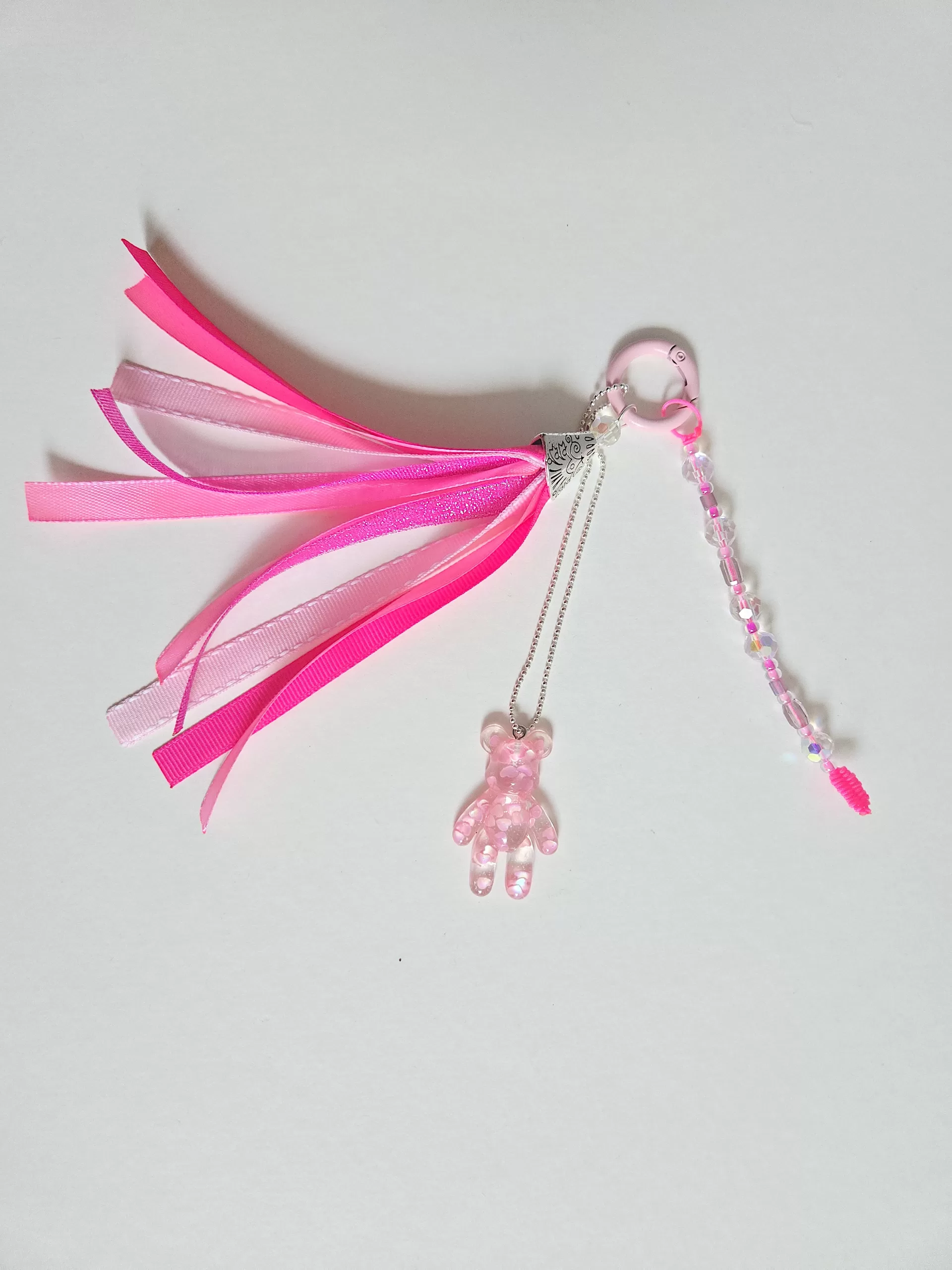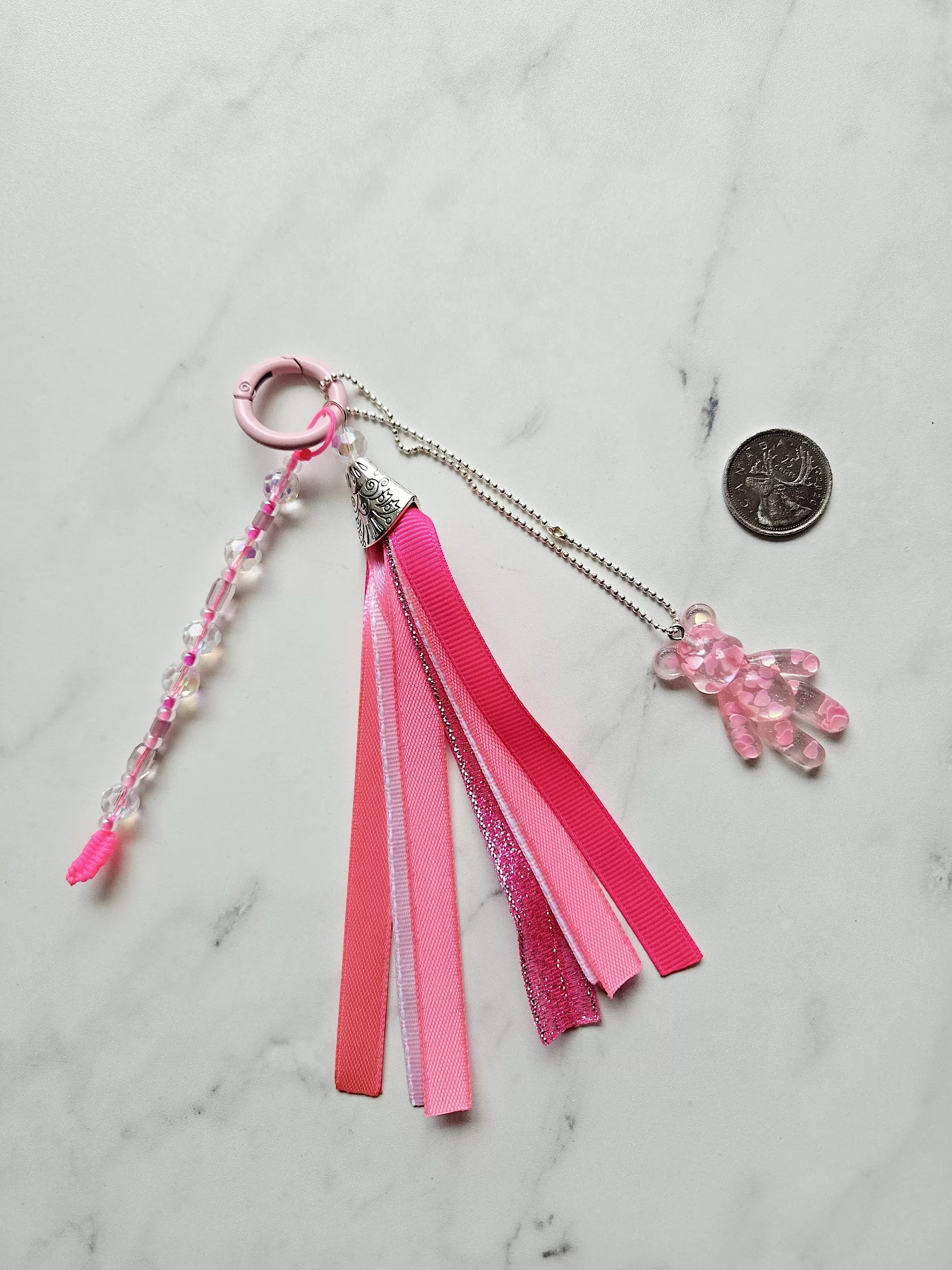 A standout, hot pink Purse charm accessory. Adorable heart-sparkle pink bear drop, pink-corded iridescent crystal drop and multi-hot pink ribbon tassel drop. Add this accessory to any purse, travel bag, backpack or jeans to spunk up the accessory of your choice.