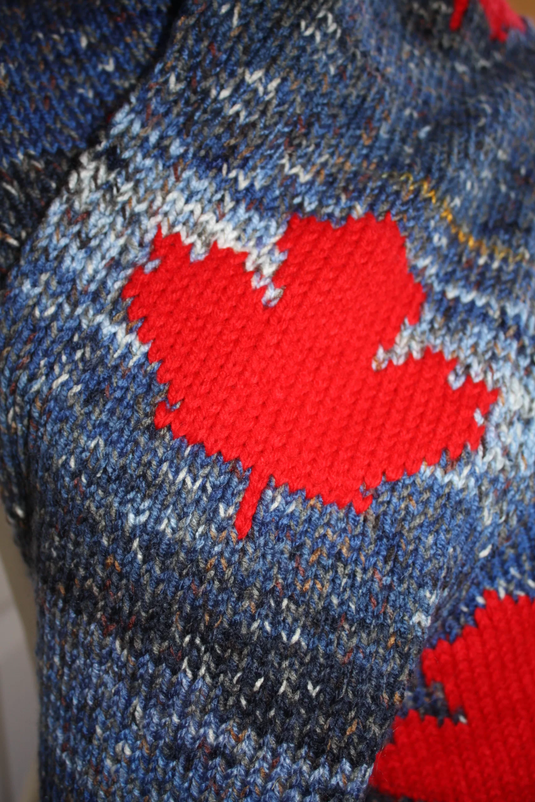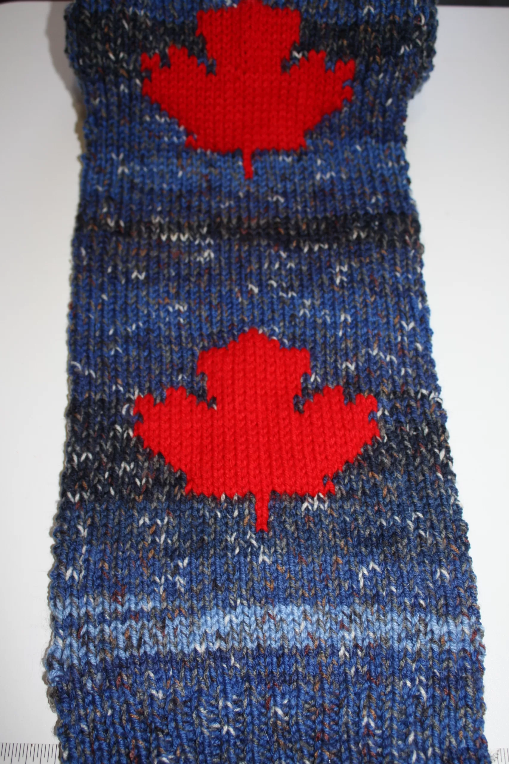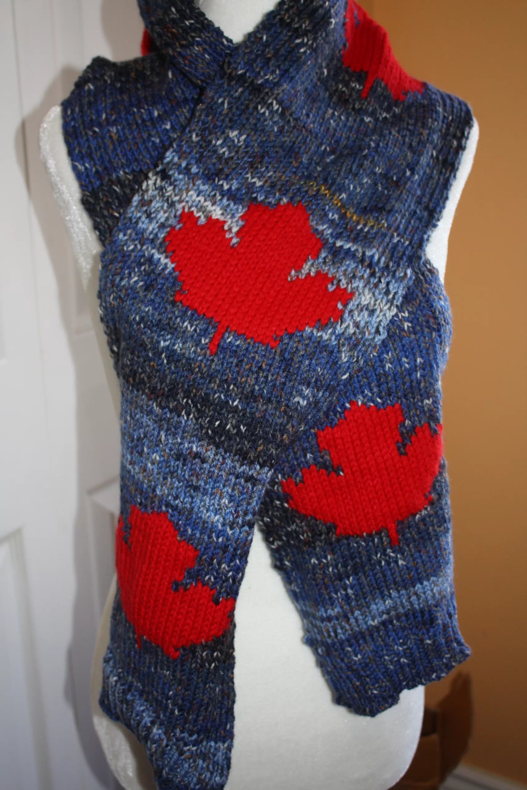 This is my new knitted Maple Leaf scarf design. This scarf has red maple leaves on a shades of blue background. Ends are finished in ribbing and the edges are specially knit, to prevent excessive curling. Made with 100% acrylic yarn. Nice length and comfortable width. Elbows up!!