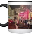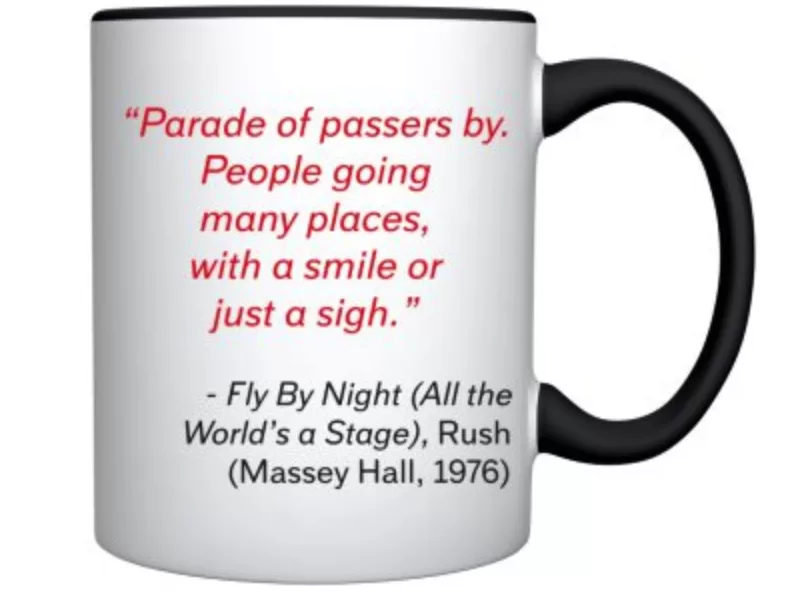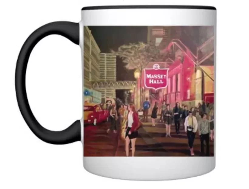 Ceramic mug features an original acrylic painting of Massey Hall, Toronto, Ontario (painted by Leslie Hetherington). The reverse side features a quote from Rush’s “Fly By Night” song (All the World’s a Stage album), which was recorded at Massey Hall in 1976.
