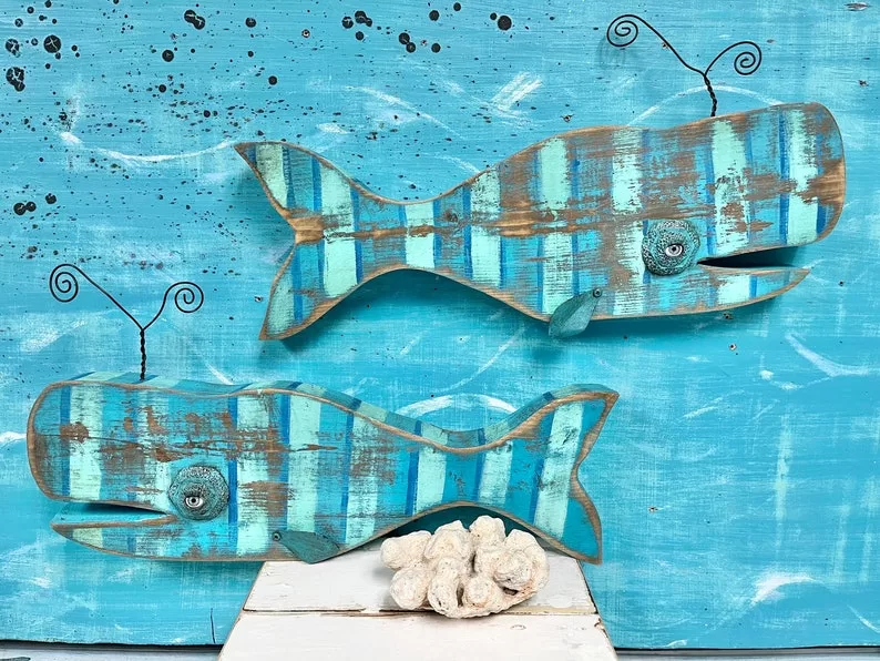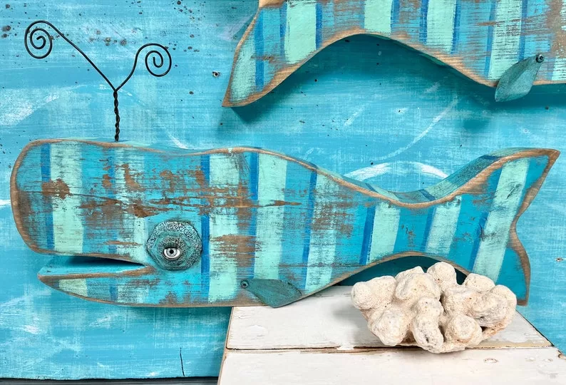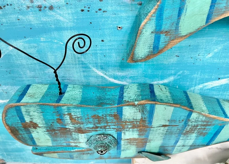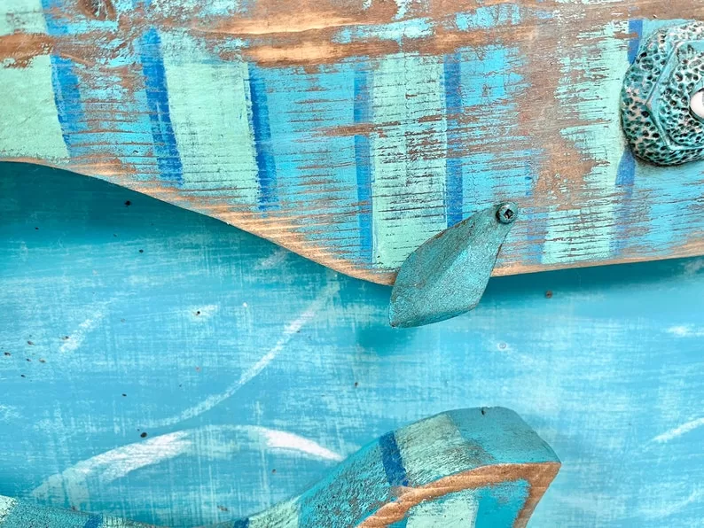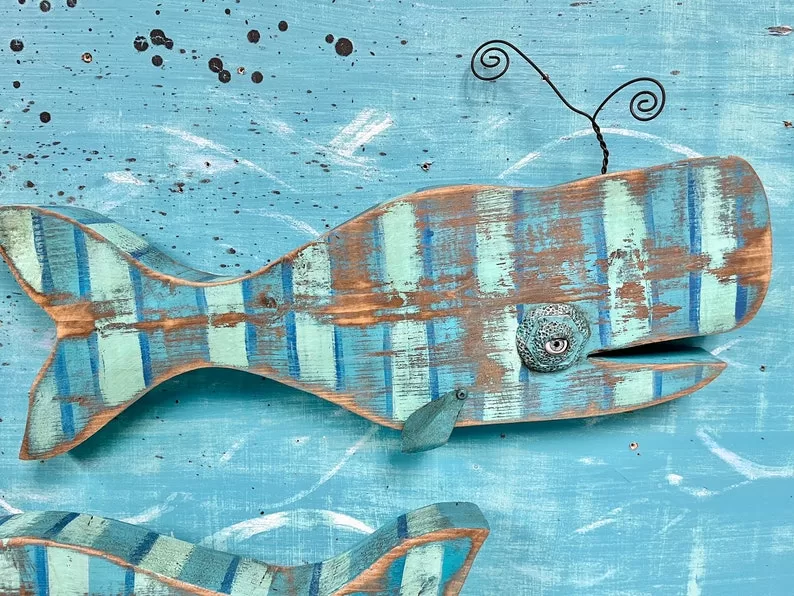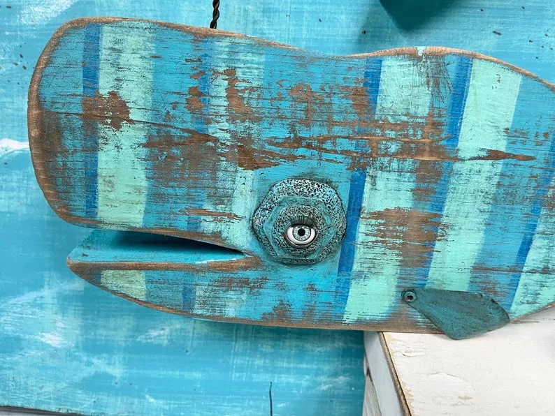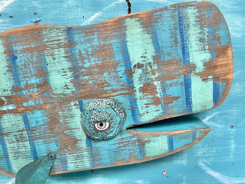 CastawaysHall has the best beach house gifts and sustainable, recycled art decor with personality. This fantastic little painted wood whale in turquoise, blue and green weathered stripes will be a delight at any age and in any room, whether it’s a bathroom or a nursery. Made from old thick wood, painted in colour layers and then distressed. I’ve added a vintage sleepy doll eye sculpted into a clay barnacle. The eye closes when laid down flat. It has a twisted wire spout which will be removed for shipping. Simply pop it back on the hole on top. It has a wire hanger on the back for hanging. Choose from facing left or facing right.