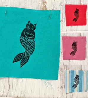 Hand Printed Sew On Linen Patch – Mermaid Cat – Choose Your Colour By CastawaysHall