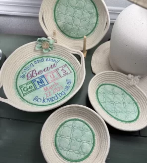 “So Tiny and Small” Personalized Baby Gift Set, Trivet with matching monogramed mini bowls.