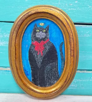 Mini Black Cat & Bird Painting: Gold Oval Frame, Cat Lover Gift By CastawaysHall