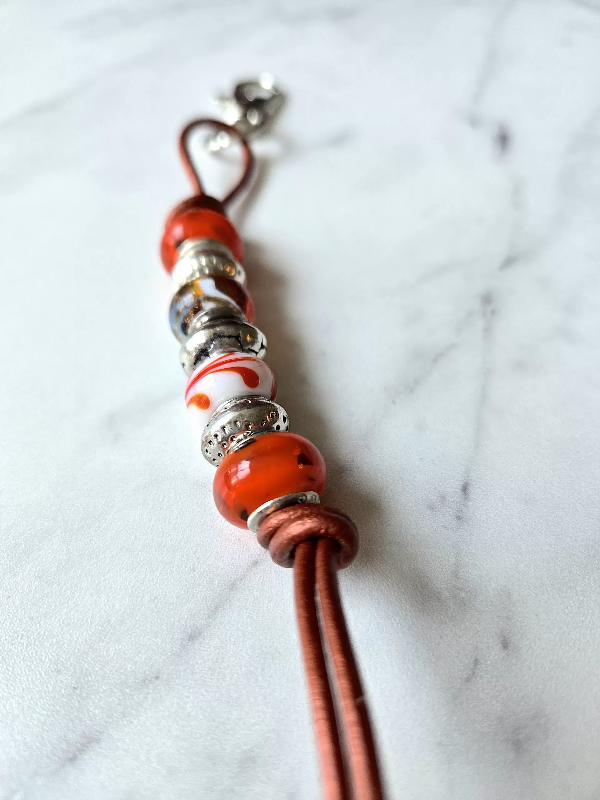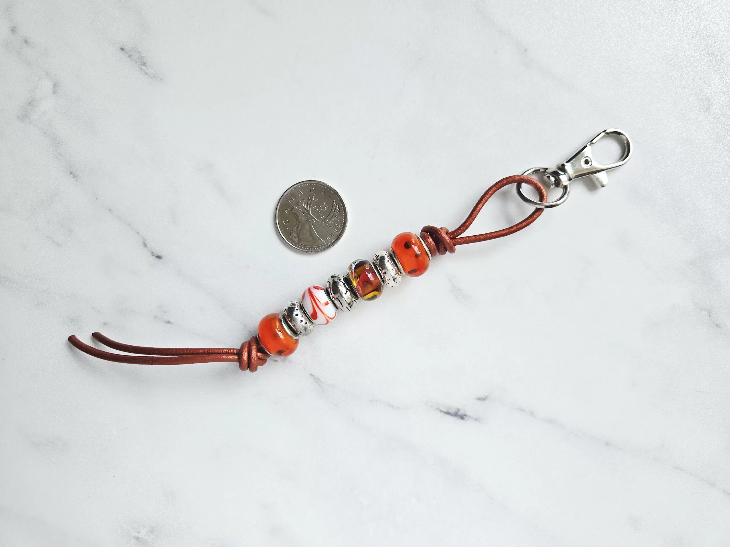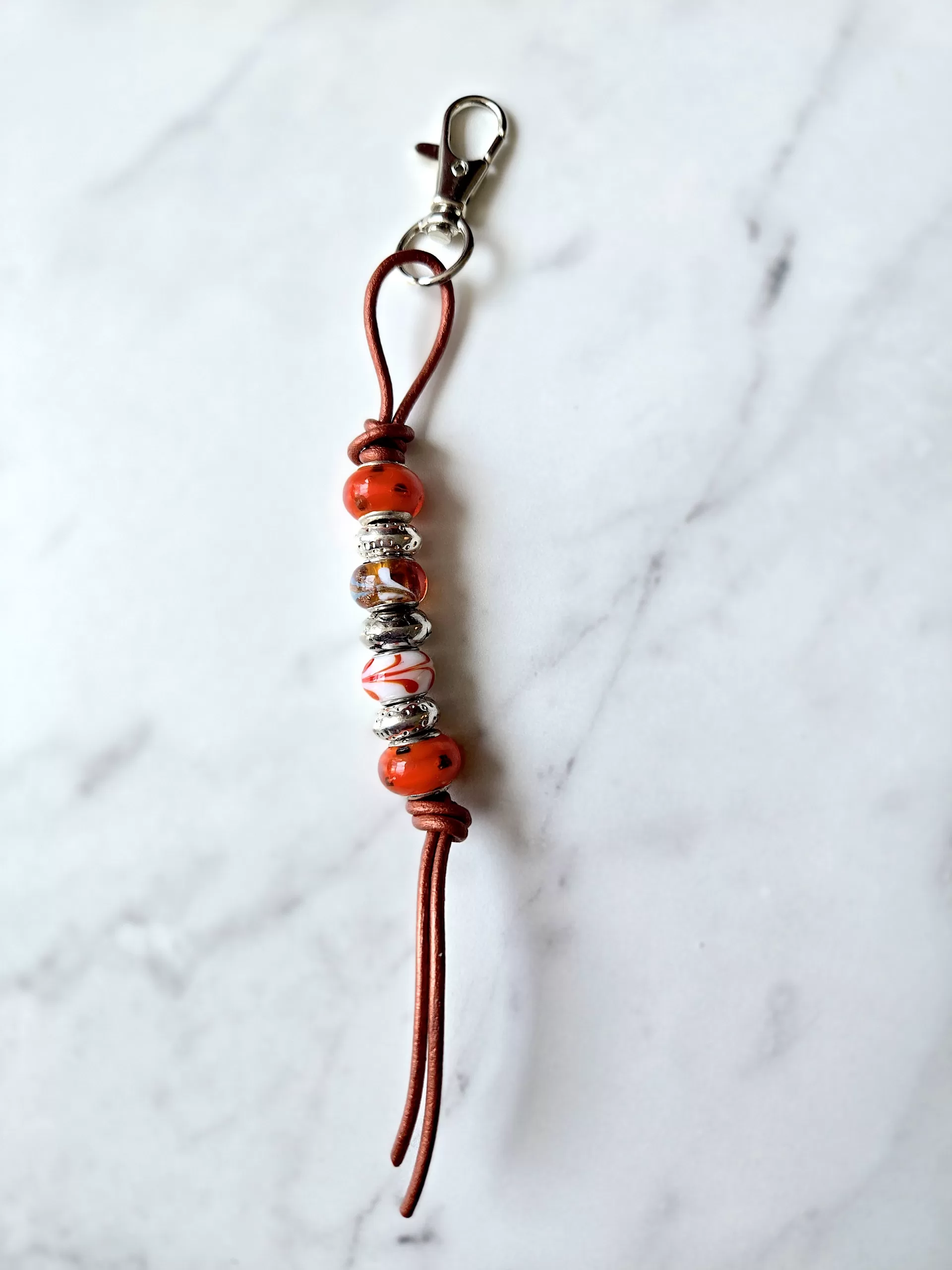 Pumpkin orange glass purse/backpack/jeans charm. This mix of ‘Pandora-style’ mixed glass beads accented with silver spacer beads on a metal orange leather cord will add charm to any purse or outfit.