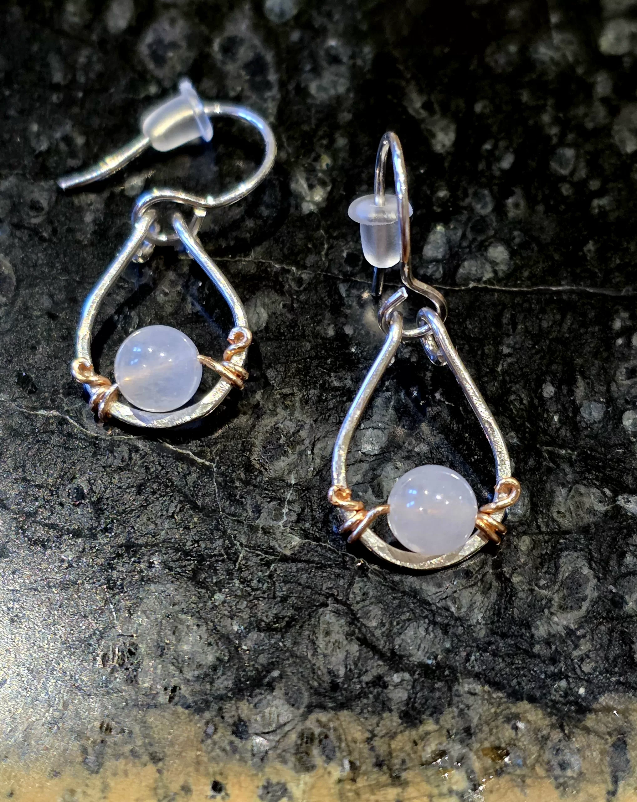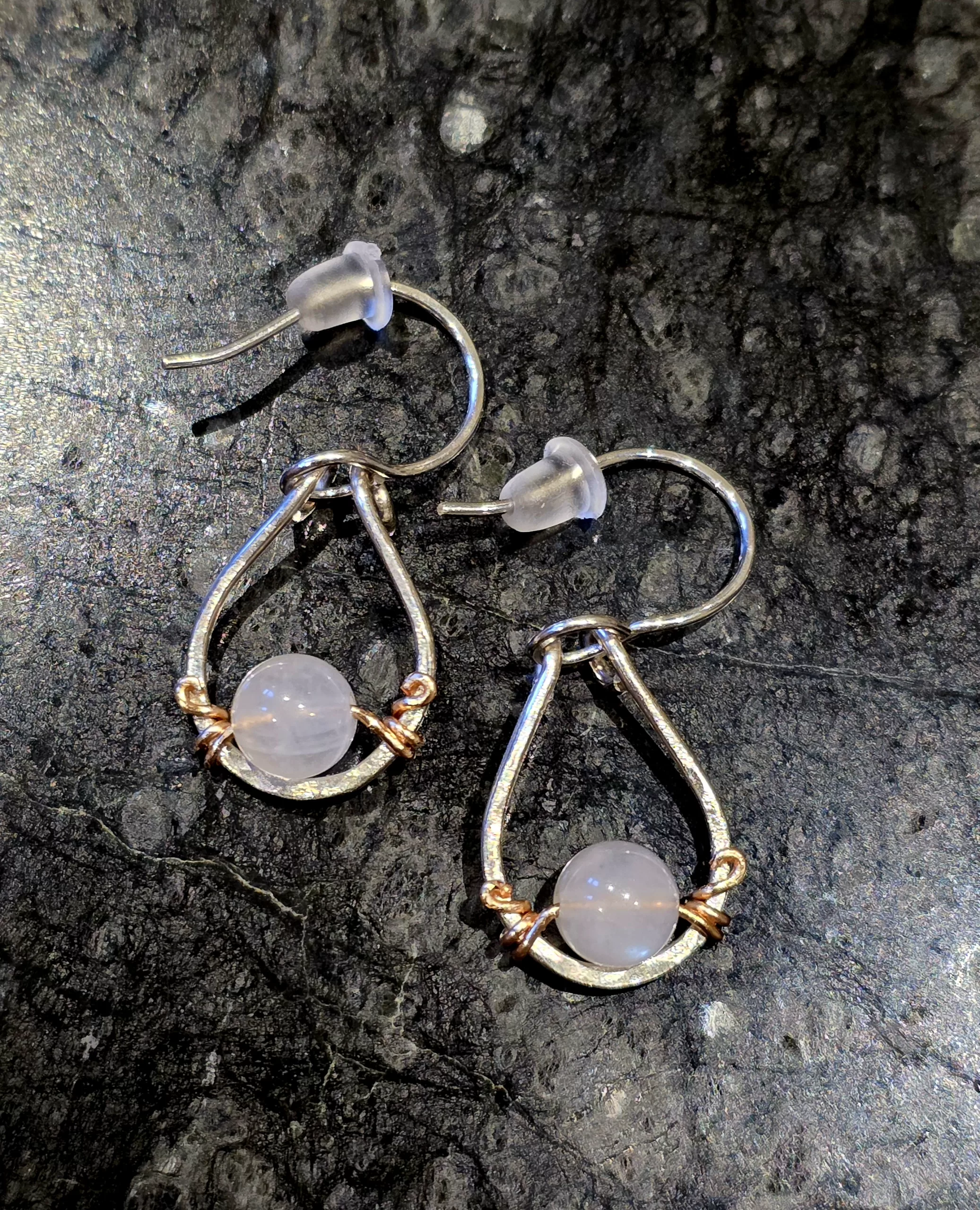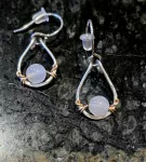 Rainbow Moonstone Earrings hand crafted with Sterling Silver Wire  with a slight accent of Gold Plated Wire. Moonstone help connect to the energy of the Divine Feminine.Its a powerful stone for developing intuitive awareness. Approx H 1.5 inches W .5 inches.