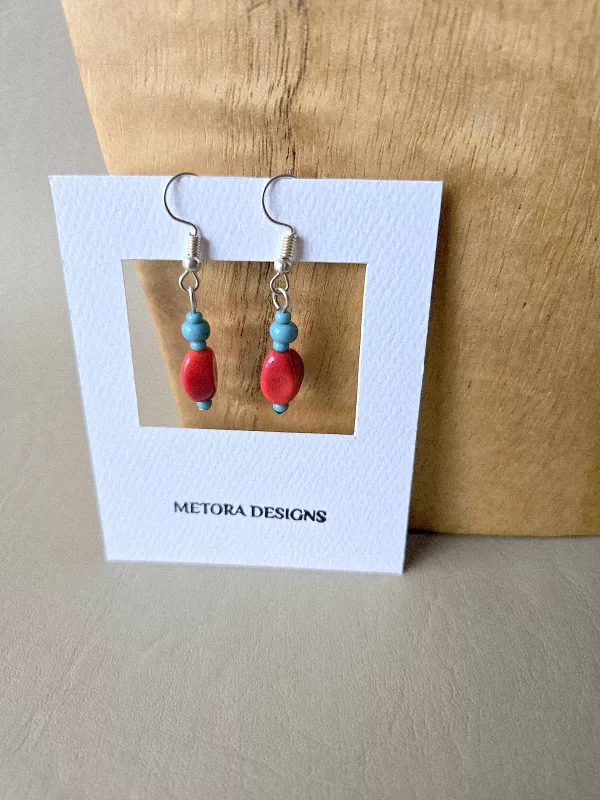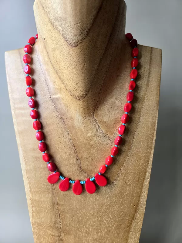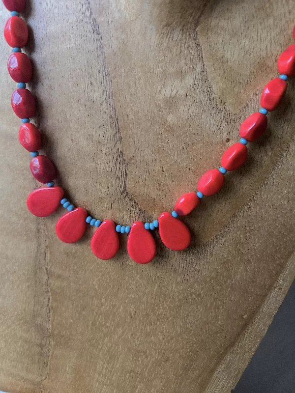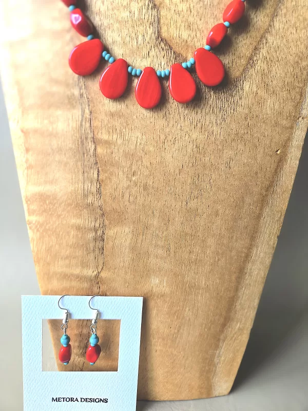 Organic-shaped red beads with red teardrop center beads and turquoise seed bead accent. Matching earrings makes this set complete.