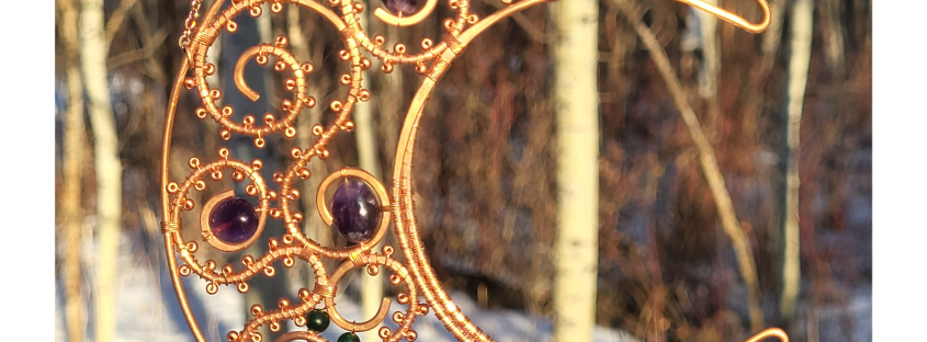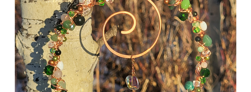 Copper wire suncatcher with a variety of glass and semi-precious beads.