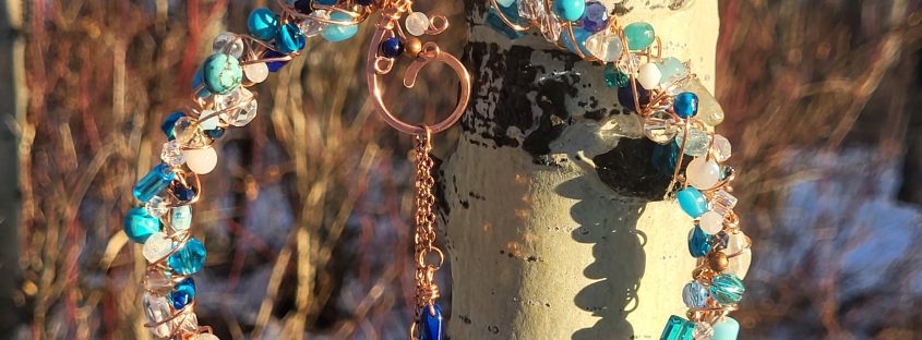 Copper suncatcher with an assortment of glass and semi-precious beads.