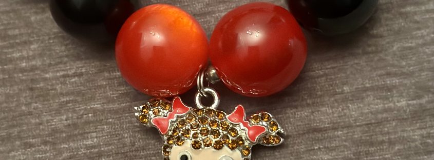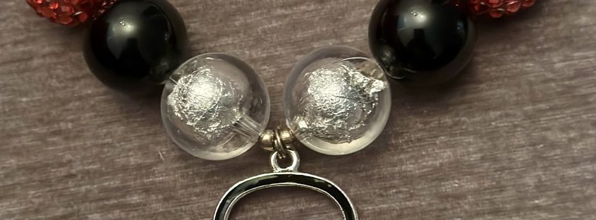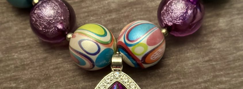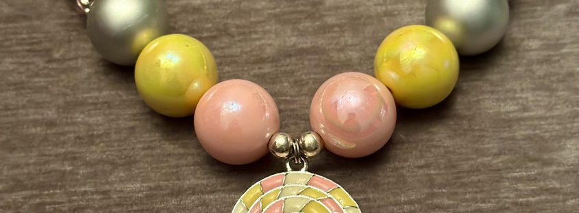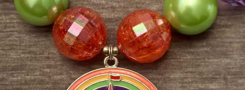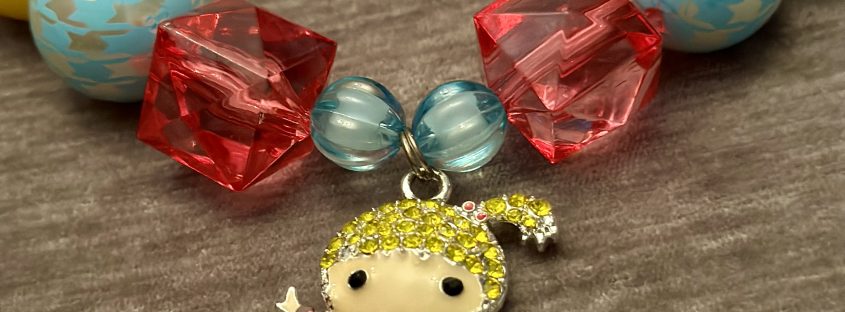 Cute, colourful, handmade children’s chunky beaded necklace with a charm is a delightful accessory for any little one. This charming piece features vibrant and playful beads in various shapes, sizes, and colours, creating an eye-catching and whimsical look.