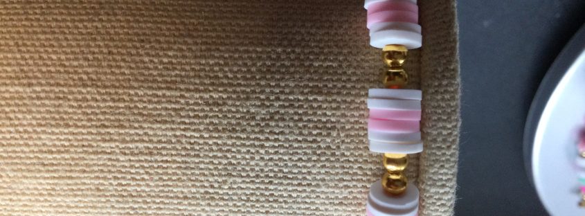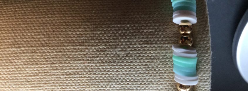 Pastel aqua, pastel blue, and white clay beads with round gold spacers