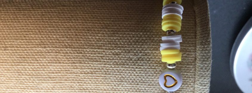 Pastel aqua, yellow, light gray clay beads with round brass spacers