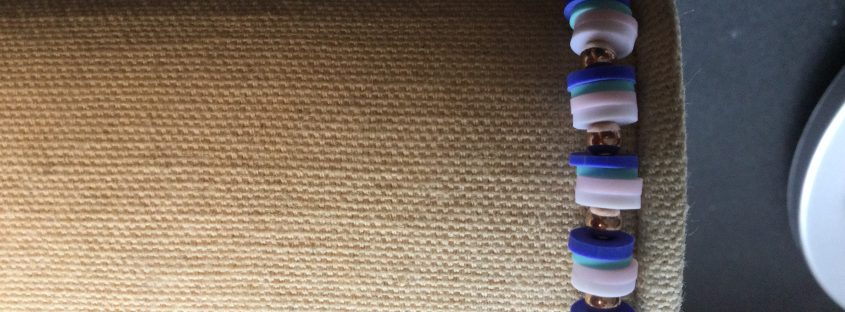 Blue, pastel aqua, pastel peach, and white clay beads with round gold spacers