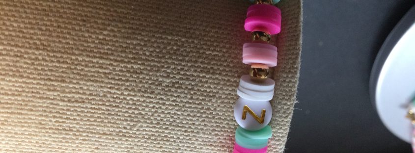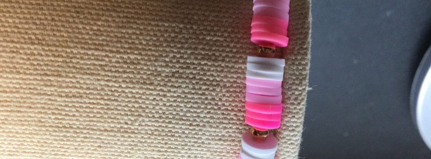 Bright Pink, pastel pink, pastel aqua, and white clay beads with round gold spacers and a Z bead