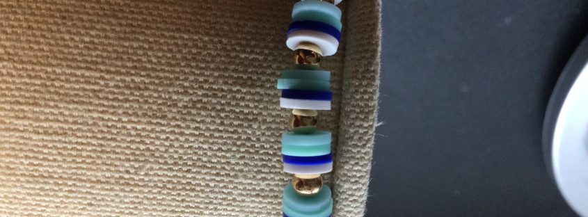 Dark blue, pastel aqua, and white clay beads with round gold spacers
