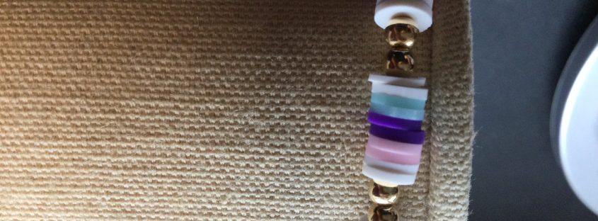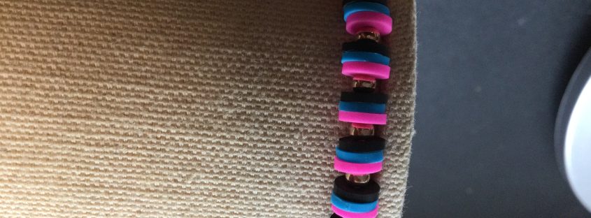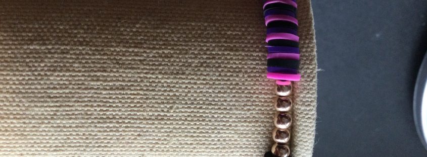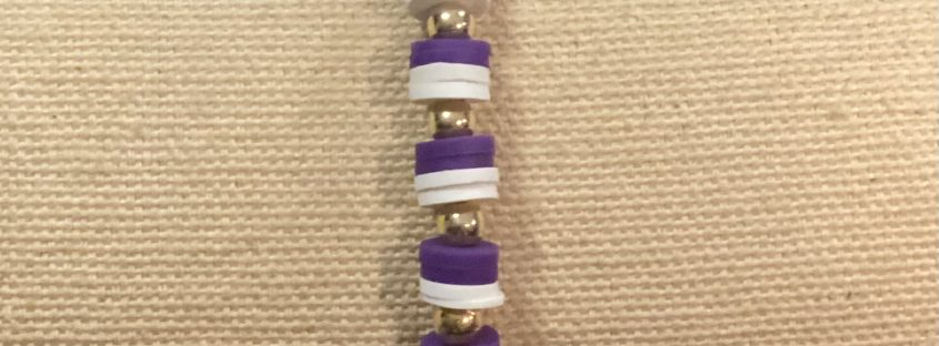 Pink, Purple, and Black clay beads with 5 round gold spacers
