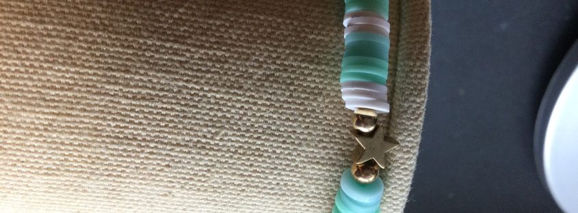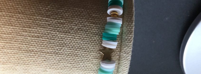 Shades of teal and white clay beads with round gold spacers and one gold star spacer.