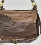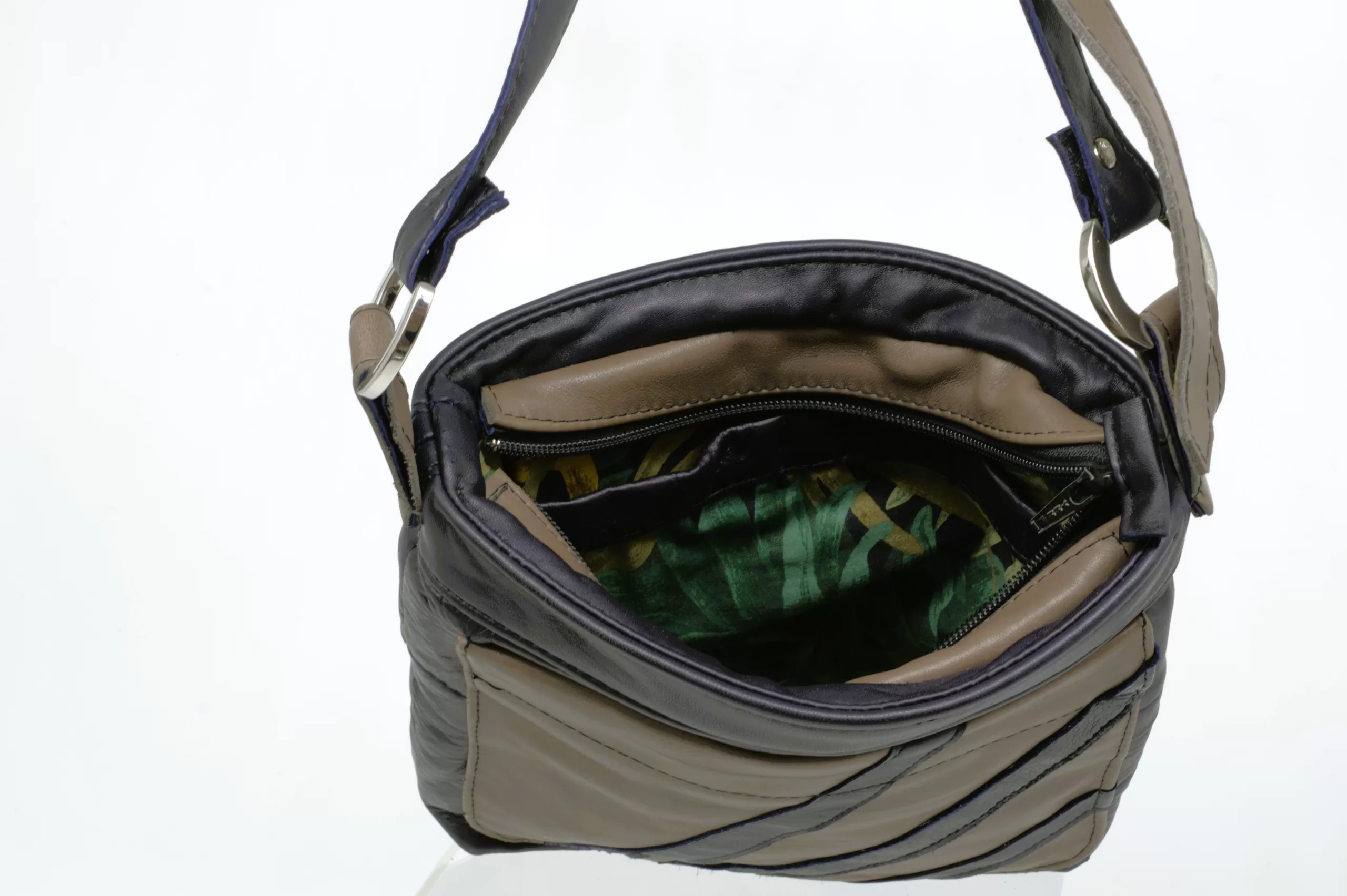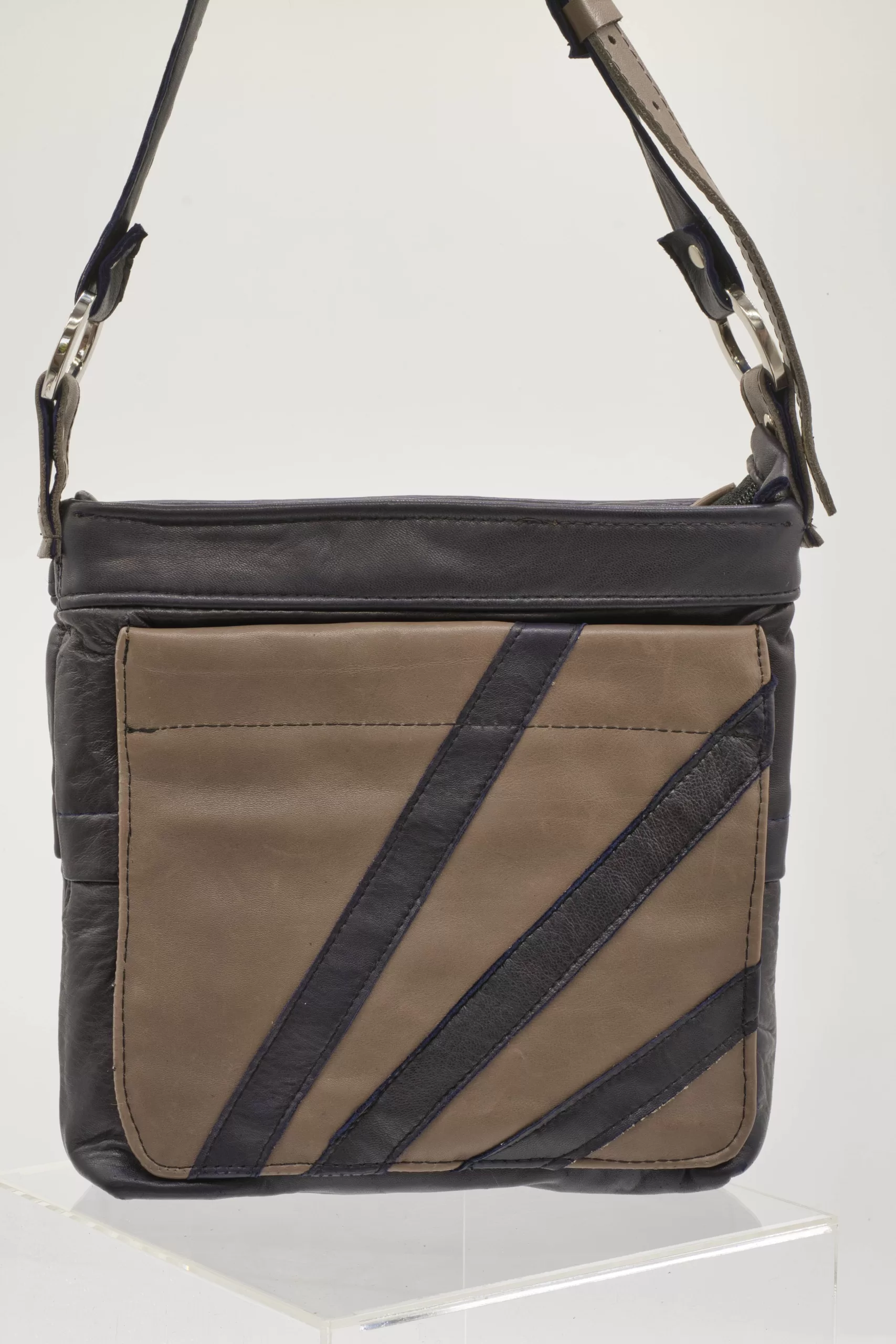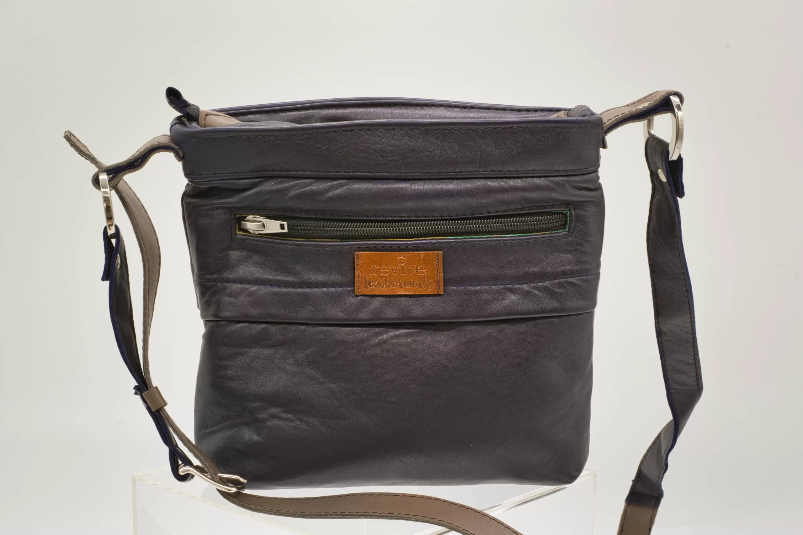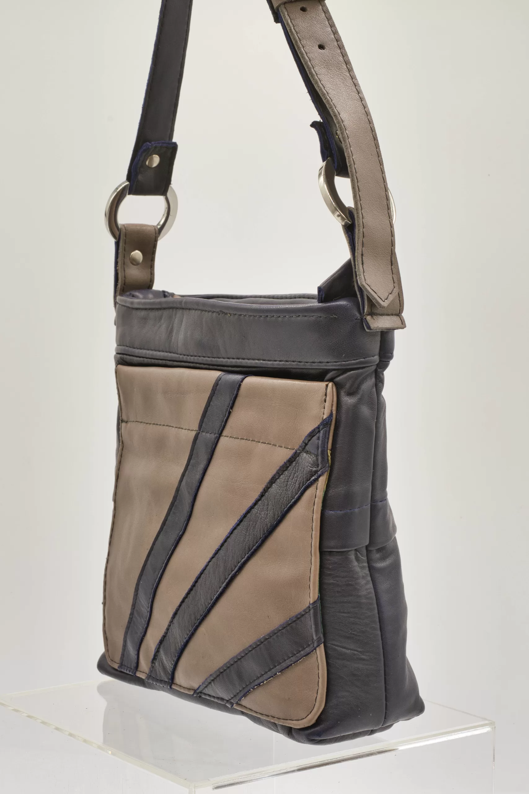 Taupe and purple upcycled leather cross-body bag