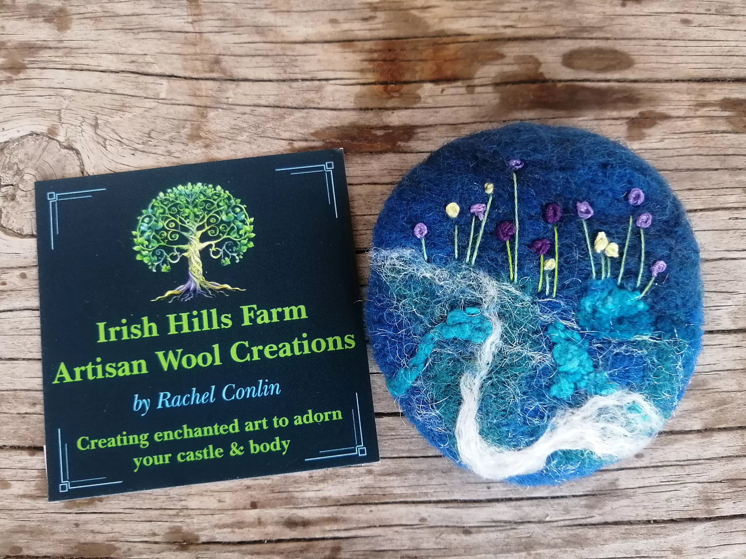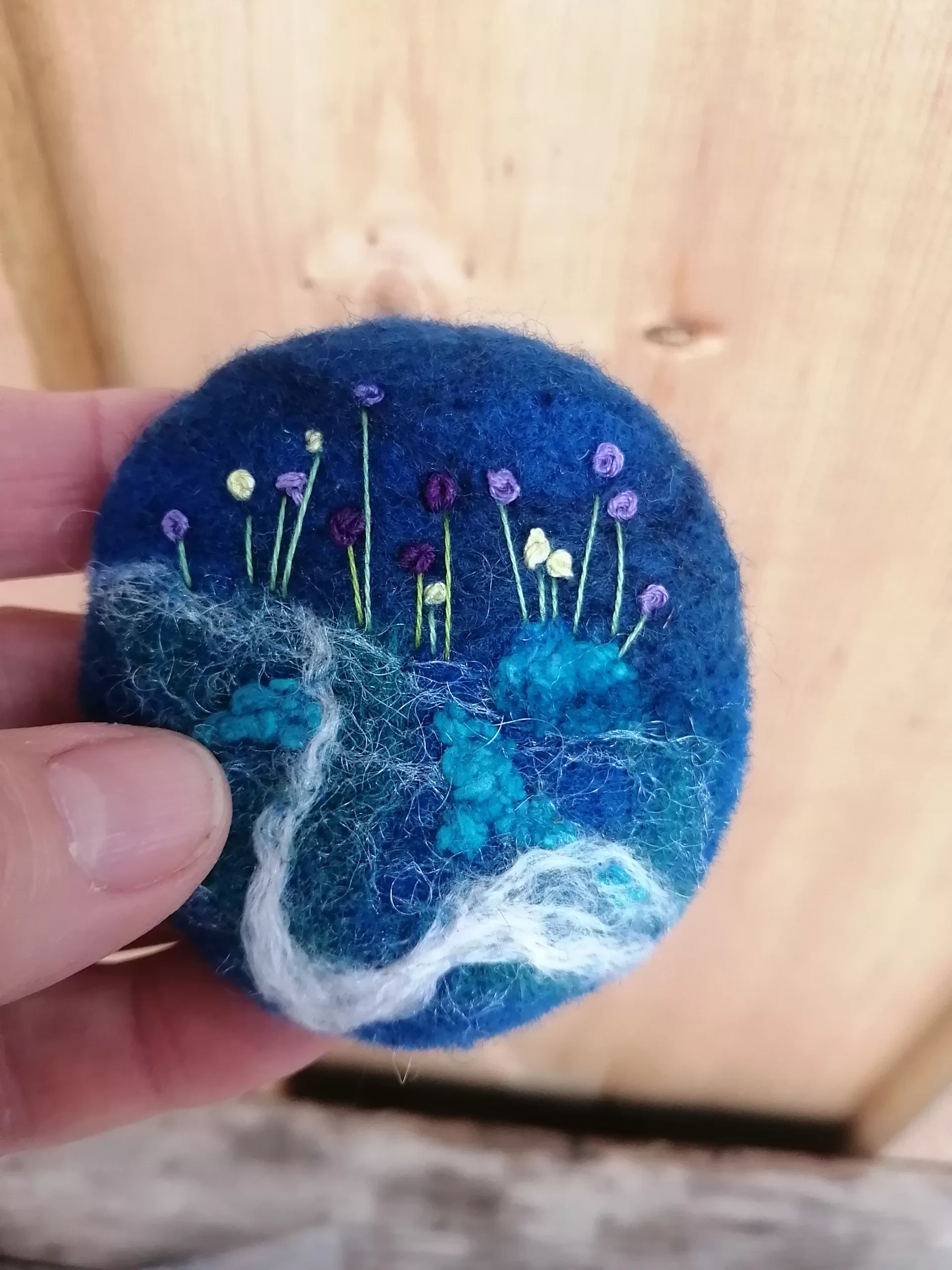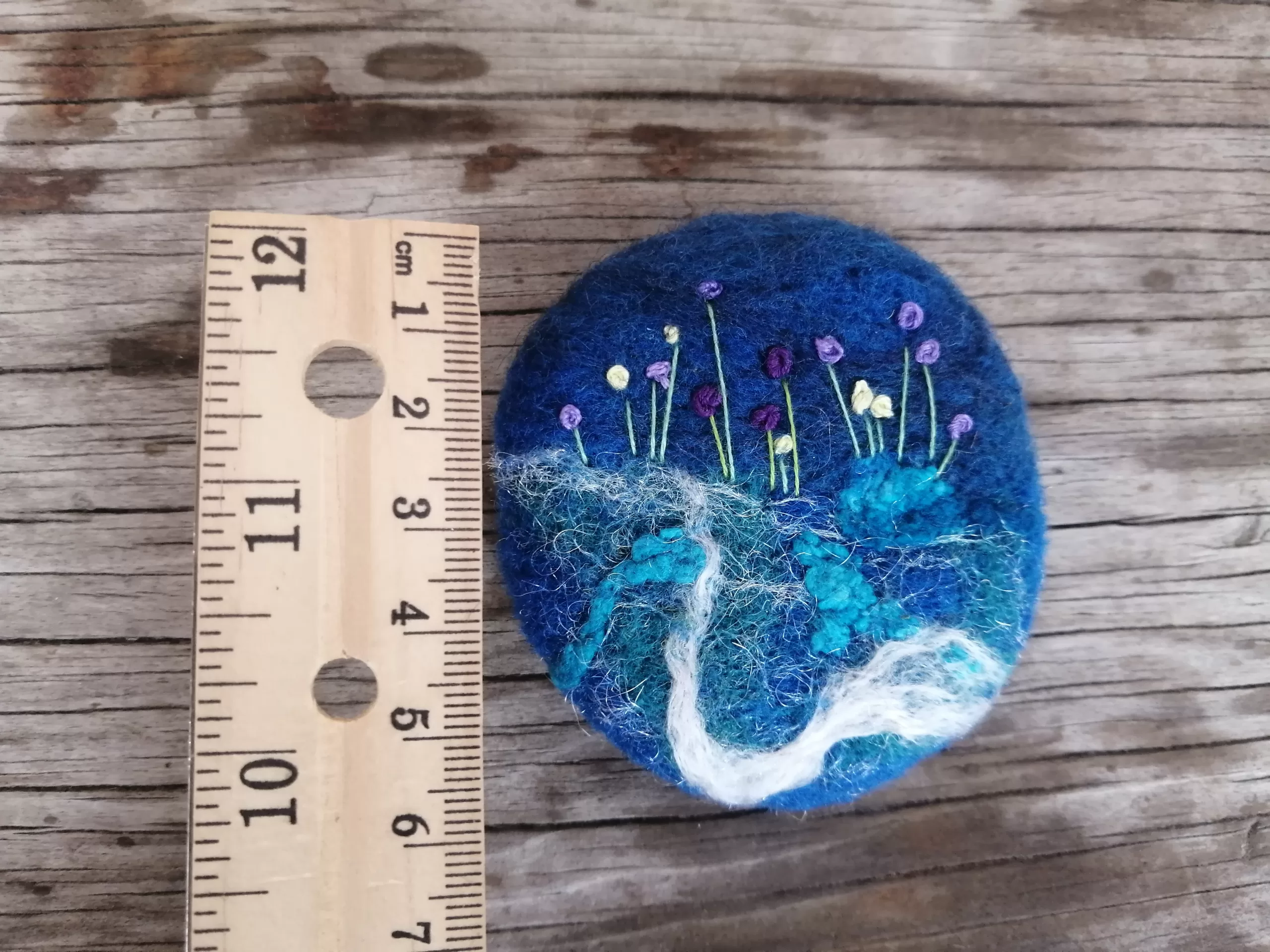 The wool I use for these brooches comes from Canadian sheep farms. I hand dye the wool, heat setting it and then create these delightful brooches by felting the wool with a needle. By the way I handle the needle I am able to manipulate the wool into a specific shape. I love detail, colour and wool, so doing this process is definitely a labour of love! Once I finished with the wool felting part, I sometimes use embroidery threads to sew or felt in more detail. I’ve securely sewn a brooch pin on the back and my label. Â Makes a wonderful shawl pin, especially for a beautifully hand knit shawl. It also looks wonderful on a sweater or coat or to adorn a scarf or hat. It measures approximately 2 3/4″ around.